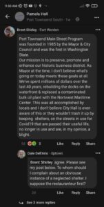 But one comment stood out for the person who first alerted me to this poll. He sent me a screen shot of the response from Brent Shirley, former mayor of Port Townsend, who was at the City’s helm when Port Townsend Main Street first came into existence: