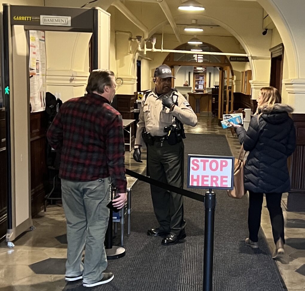 This forces everyone entering the building to walk through a metal detector and be searched by sheriffs for weapons (including keychain pocket knives) — perhaps appropriate for courtrooms, but time-consuming, invasive, and expensive overreach when it comes to folks just wanting to pay a tax bill, renew a license, or ask a question.