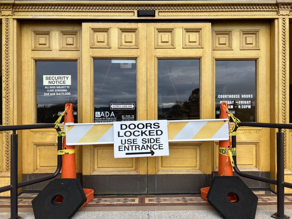 Jefferson County Courthouse moved its courtroom security checkpoint down from the second floor to the basement in 2020 to enforce lockdown mask mandates throughout the building, in the process shuttering the beautiful main entrance doors on the first floor.