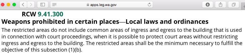 Moreover, any desire by staff to discourage unruly customers is irrelevant to the legal issue at hand. RCW 9.41.300(1)(b) requires “The restricted areas do not include common areas of ingress and egress to the building … when it is possible to protect court areas without restricting ingress and access to the building. The restricted areas shall be the minimum necessary.”