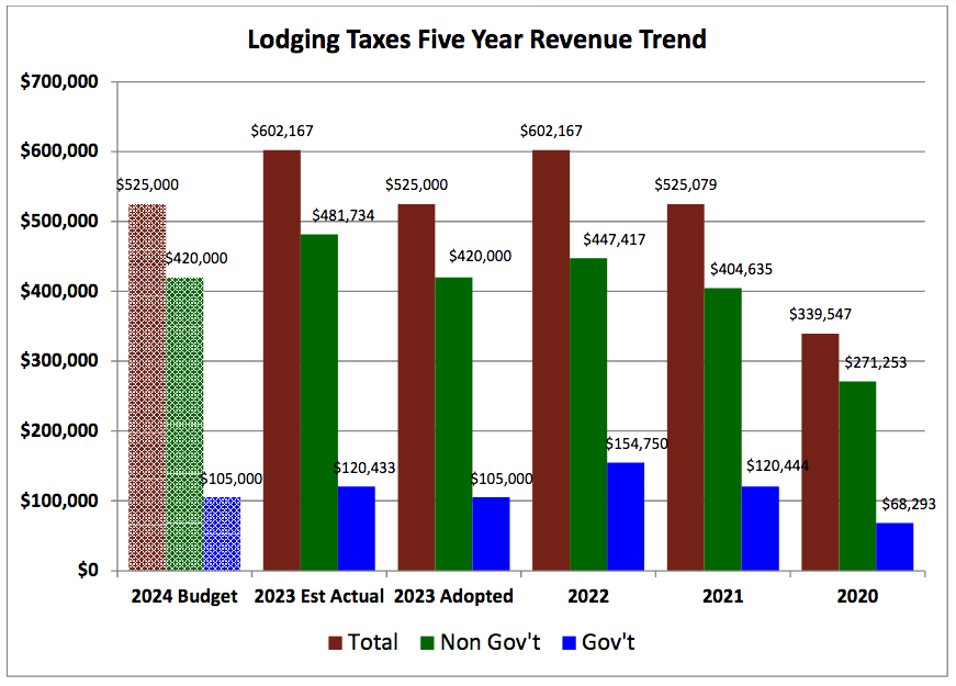 The Lodging Tax, a proxy measurement for tourist activity, shows revenues pulling back to 2021 levels.