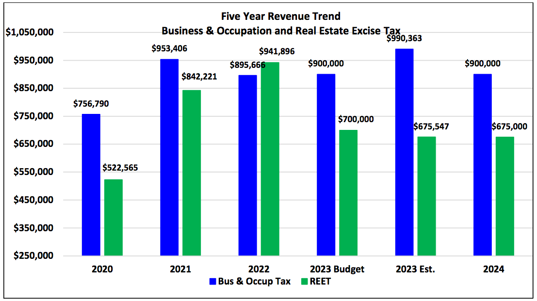 Business & Occupation tax receipts, a reflection of economic activity, have on average since 2021, been flat at $927,000, and are predicted to decrease in 2024. The Real Estate Excise Tax, which is generated by real estate sales, has declined steadily from 2022 and continues its downward trajectory in 2024.