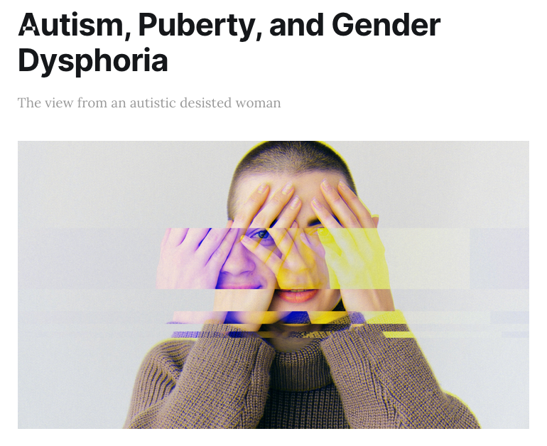 “After six years of identifying as a trans man as a teenager, I desisted (stopped identifying as trans) at the age of 21. Since reclaiming my womanhood, I have been thinking long and hard about what exactly happened in my 15-year-old brain that made me feel I would only be stable and fulfilled if I took testosterone, changed my name and pronouns and socially became a man. The conclusion I have come to is that thinking I was trans was completely inseparable from my autism.”