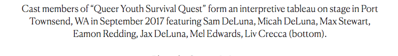 After I learned about the theories behind these policies and their wider impacts, I decided to look closer at how these ideas spread through our Port Townsend community. I discovered that 2017, the year my daughter and I had our first talk, was an impactful year for Gender Affirming Care in Port Townsend. Some of the youth I have mentioned, along with trans activist adults in our community, had put on a “legislative theater” performance called “Queer Youth Survival Quest.” A feature story in YES! Magazine explained that the interactive technique the production used was designed “to make concrete policy changes around a community justice issue.”