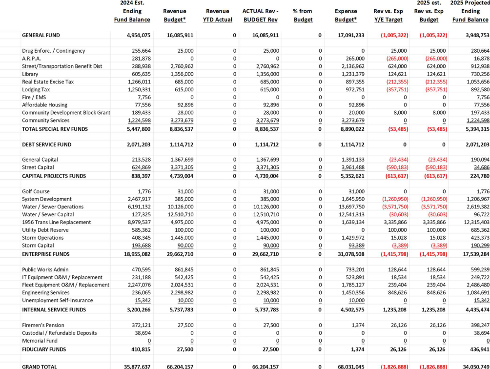The 2025 budget shows just over $2 million being banked for paying debt coming due next year. Likewise, funding for streets is up significantly from taxing through the Transportation Benefit District, and the budget shows large expenditures on capital projects needing attention. Further, a rainy day fund had about $248,000 at the start of the year, not a huge amount, but at least something positive.