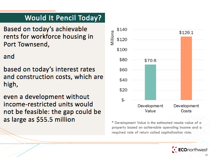 Much higher rents would have to be charged than currently prevail in Port Townsend’s already unaffordable rental market. Interest rates would have to drop significantly and the economy would have to return to conditions resembling those in 2013. And construction costs would also have to be reduced significantly, which was not possible if the kinds of buildings in the Final Master Plan were used.