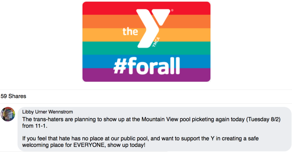 The day after the meeting, Wennstrom encouraged people to confront the “trans-haters” who were protesting the Y’s treatment of Jaman and the pool’s policy. On the Y’s Facebook page Wennstrom posted: