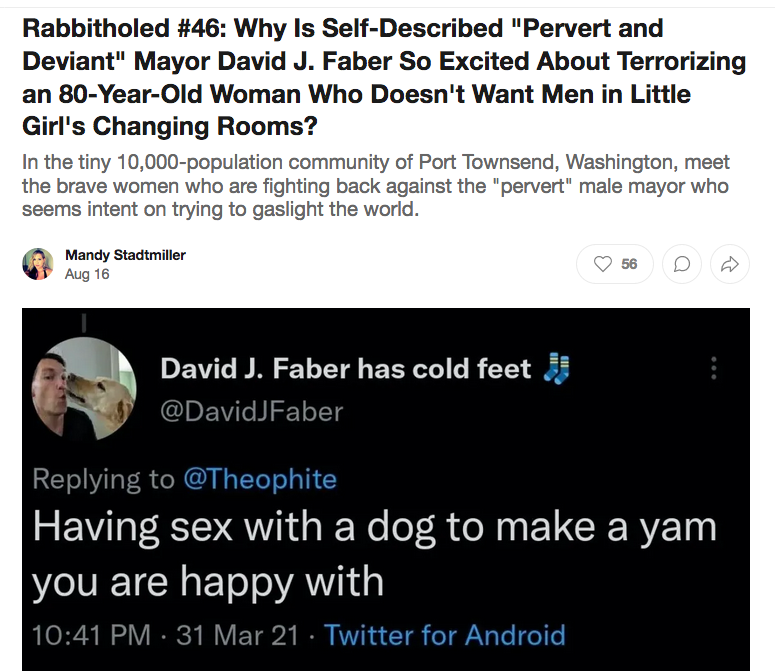 “The mayor of Port Townsend doesn’t seem to think my concerns deserve respectful consideration. I think women/girls deserve the sex based provisions that our foremothers battled for centuries to attain, privacy, safety, & dignity for our BODIES,” Sousa wrote in response to Faber’s tweet.