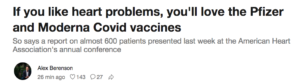 A doctor told me, “I’ve seen a lot more people having to go to the ER with high blood pressure and atrial fibrillation—enough that they are in danger of having a stroke.” Another contact described a woman who has been having heart issues post-vax. Her heart began racing soon after the shots—tachycardia. She is now on drugs in an effort to keep her heart rate down, with a medical team that doesn’t know what else to do.
