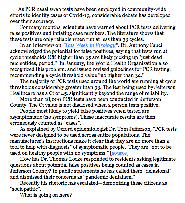 But not even a credentialed physician, one who I daresay has greater understanding of PCR’s uses and limitations than Locke, is permitted to offer a professional perspective in the Leader if it diverges from Jefferson County’s Public Health Director. Rather than requesting interviews or promoting healthy debate on an issue that is profoundly impacting every one of us, there is only the silencing of any viewpoint that does not support the official narrative. A “unified approach.”