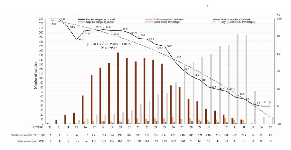 GRAPH 1: Percentage of positive viral culture of SARS-CoV-2 PCR positive naso-pharyngeal samples from COVID-19 patients. No sample that was positive at a Ct >35 had a positive culture. (Reference 18: Jaafar R, Aherfi S, Wurtz N, et al. Correlation Between 3790 Quantitative Polymerase Chain Reaction–Positives Samples and Positive Cell Cultures, Including 1941 Severe Acute Respiratory).