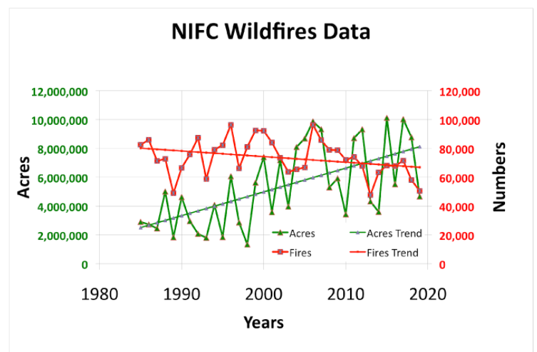 Then there is the claim that global warming is causing more fires. The data runs counter to that claim, as shown by data collected by the National Interagency Fire Center. And using “acres burned” as a stand-in for fires is highly deceptive. Most forest management experts indicate that the increase in acreage burned is due to mismanagement.
