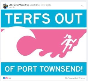 Which brings us to Port Townsend City Councilor Libby Wennstrom. Following the August 15 mobbing of older women who were calling for respect for women’s dignity and safety, she posted on her Facebook page a call to expel all “TERFS” from Port Townsend. That acronym for Trans Exclusionary Radical Feminists has become a sexist term used to justify violence and threats against women who do not buy into the fiction that a man or boy — human males — can magically become a woman or girl — human females — by snapping their fingers and switching around the blue and pink in their wardrobe. Ana Wolpin covered that bit of hate-mongering from Wennstrom in her article, “City Officials Lead Hate Campaign Against Women.”