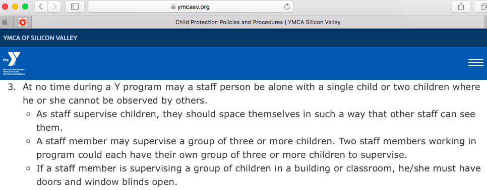 We found the following exact same child protection policies (even formatted exactly the same) in a number of YMCAs in different areas of the country. This is copied from the manual of the Silicon Valley YMCA: