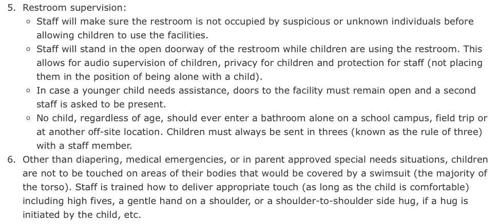What policy? What in those bare four sentences on an issue as important as protecting children from the sexual predation and misconduct that has plagued YMCAs provides privacy for children and protects staff from being alone with a child? Something is missing from what Hawkins says is the Olympic Peninsula YMCAs bathroom policy for children. The “Rule of Three” of which Adams spoke in his interview and Hawkins described to me is not there. Yet, both have stated this “Rule of Three” is a requirement regarding bathroom use by children.