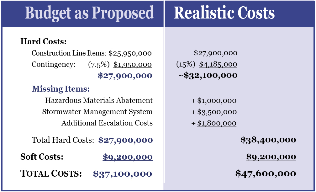 The initial 30-40% upcharge would primarily be based on increased labor expenses as the labor rate for public works/taxpayer-funded projects are required to be set at the current prevailing wage rate. All told, an additional $4 to $7.5 million of public/taxpayer money would be needed for the construction of the new facility.